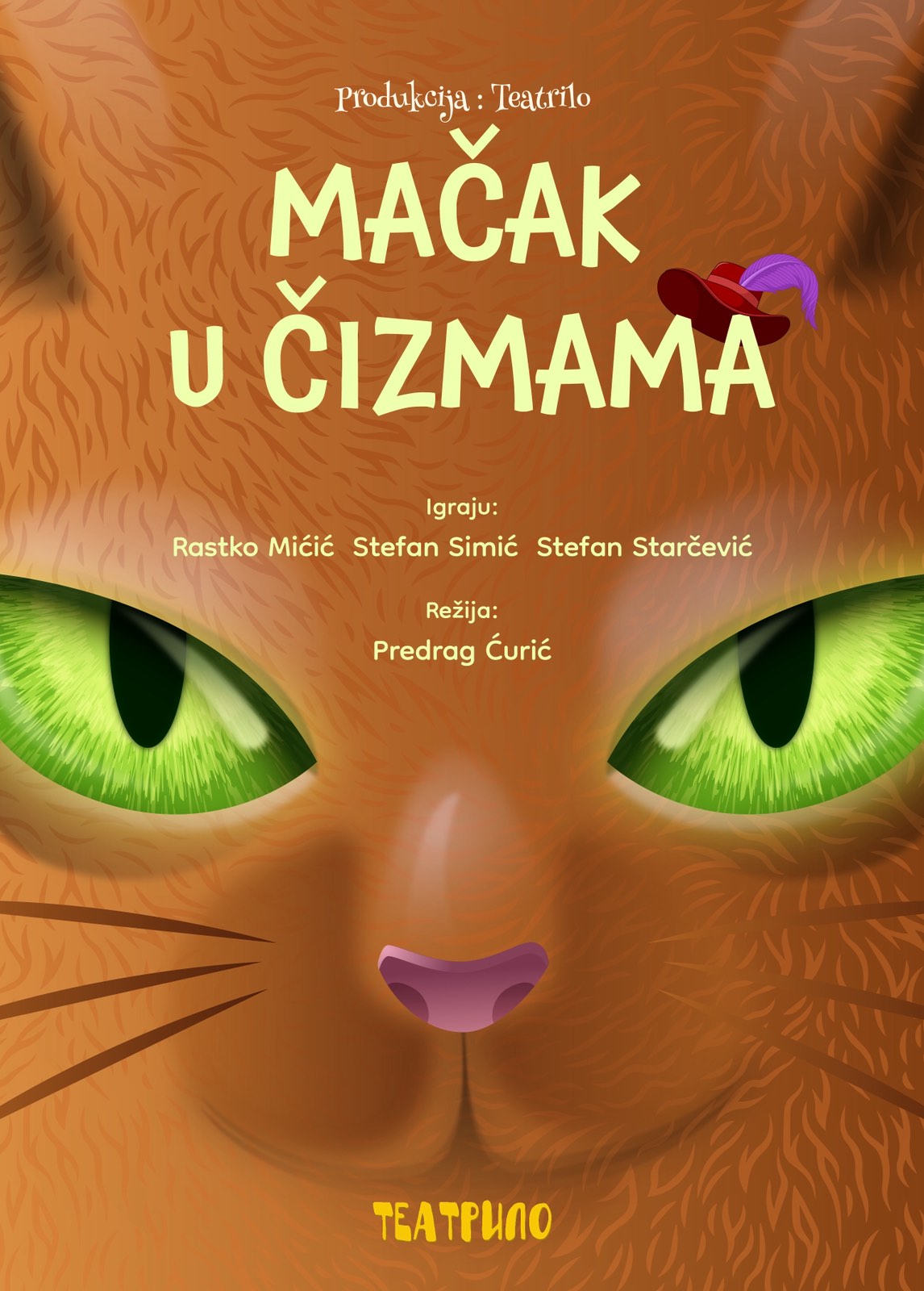 Predstava „Mačak u čizmama“ nastala je po motivima istoimenog dela Šarla Peroa. U formi šaljive muzičke bajke radnjase odvija na stoti rođendan starog Кralja čiju proslavu, uz aktivnu saradanju dece-publike osmišljava njegov verni prijatelj Mačak.