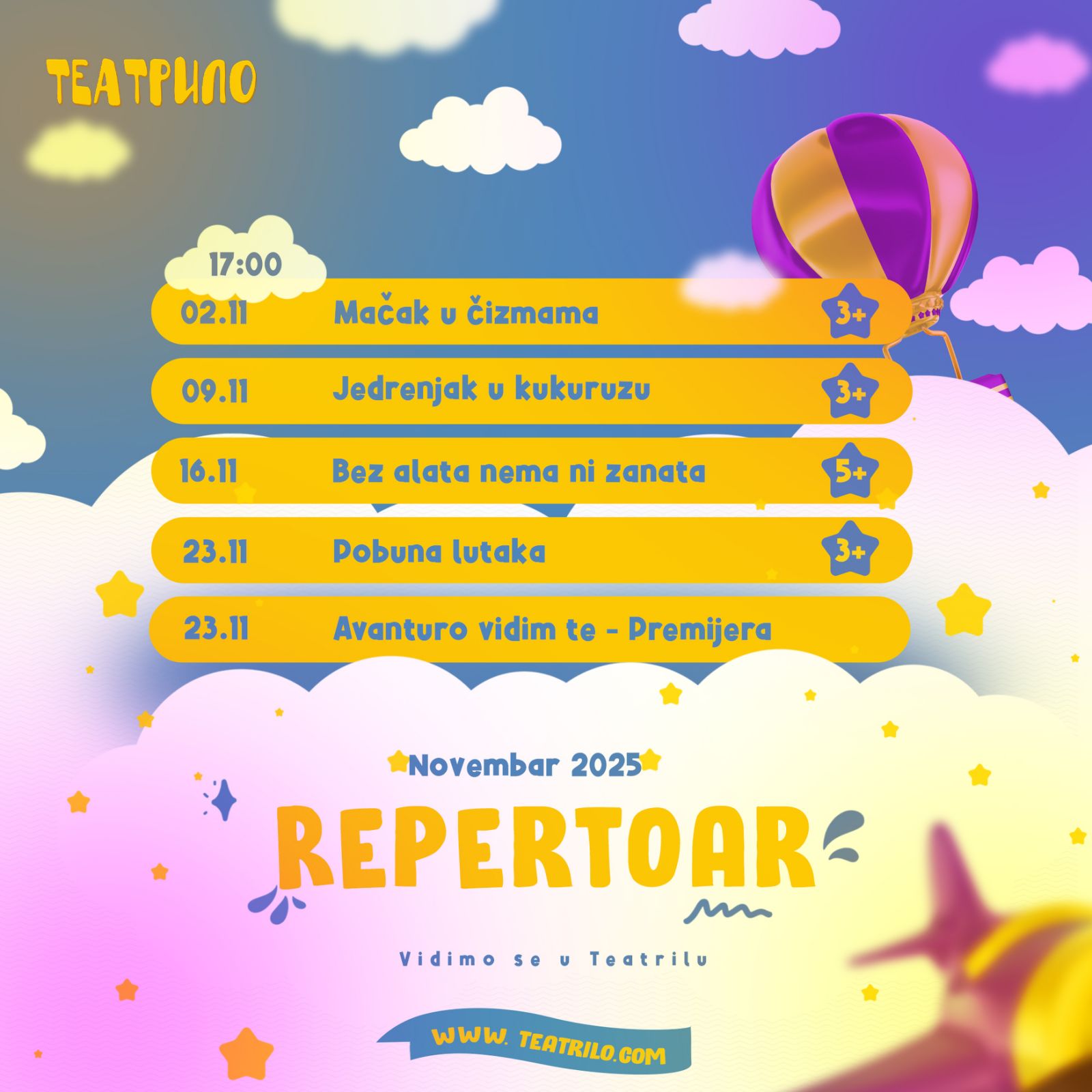 Repertoar za novembar 2025.Teatrilo28. 10. 2025.Repertoar Dragi naši, izašao je repertoar za oktobar 2025! Dobro nam došli! Ključne reči Lokacija Bilo koji datumi Kategorija Choose an Event Category Repertoar za april Repertoar za decembar Repertoar za februar Repertoar za januar Repertoar za novembar Repertoar za oktobar Vaš pregledač ne podržava JavaScript, ili je onemogućen. JavaScript mora biti omogućen da biste videli listinge. Trenutno nema događaja.